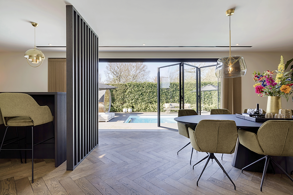 De schuif-vouwwand combineert functionaliteit en esthetiek: hij biedt flexibiliteit in gebruik zonder concessies aan het ontwerp.