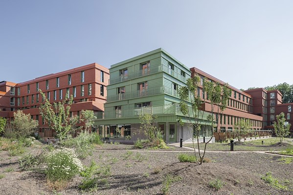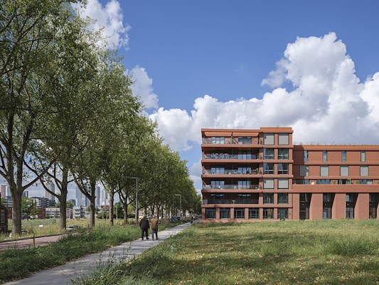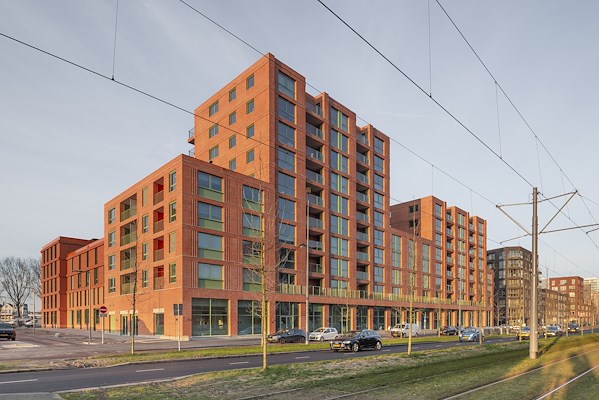 "Deze vrolijke oranje baksteenbekleding siert een kleurige entiteit die contrasteert met de groene binnentuin en de Groene Hilledijk. Een ruimtelijke eenheid, op alle niveaus architectonisch doorgewerkt." — Harm Tilman