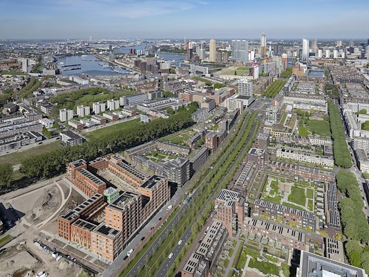 KOER is een opvallende verschijning aan de Laan op Zuid in Rotterdam. Een duurzaam bouwblok met een sterke identiteit: een balans tussen aansluiting op de omgeving, eigen karakter en een overkoepelende beeldtaal. Daarmee bouwt KOER voort op de Rotterdamse traditie van grote bouwblokken.