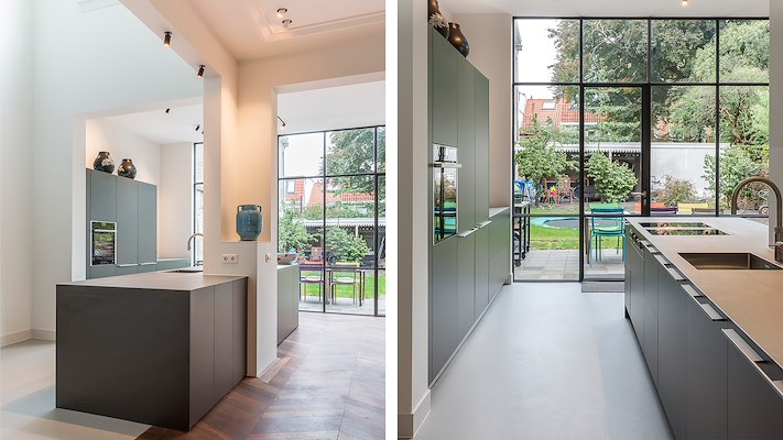 In het ontwerp is bestaande serre, die bouwkundig in zeer slechte staat was, vervangen door een moderne grotere aanbouw. Deze moderne aanbouw zorgt voor een mooi contrast met de bestaande monumentale achtergevel. Naast de aanpassingen in het exterieur is de interne structuur van de woning aangepast aan de woonwensen van de opdrachtgever. Er is een nieuwe trap naar de kapverdieping gerealiseerd en er is een vide gemaakt die een ruimtelijke verbinding geeft tussen de keuken en het trappenhuis op de eerste verdieping.