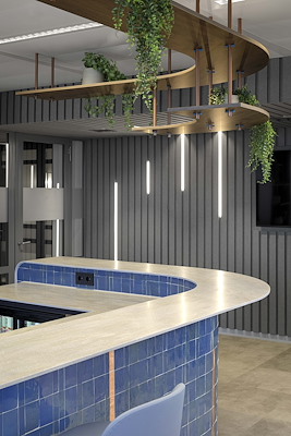 Deze thema's komen samen in een zorgvuldig gekozen kleurenpalet van donkerblauw en warme grijstinten, geïnspireerd door de natuurlijke elementen waarmee Convex werkt. Dit palet verbindt de verschillende ruimtes en creëert een harmonieuze, professionele uitstraling door het hele kantoor.