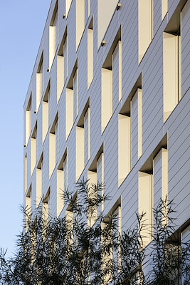 Hoewel de langsgevels in hetzelfde materiaal zijn uitgevoerd, vormen ze een contrast met de kopgevel. De gevelopeningen in de langsgevels zijn gebundeld per twee kamers waardoor een schaalsprong wordt gemaakt tussen de grote schaal van het totale volume en de kleine schaal van het individuele raam. Door te kiezen voor diep terugliggende ramen in aluminium kaders zal de kamerverlichting een rol spelen in de expressie van de langsgevels. De grote ramen zorgen ervoor dat het gebouw een bewoonde en comfortabele uitstraling krijgt.