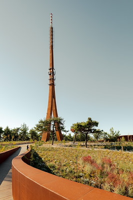 The tower stands proudly at the entrance, while the public facilities are placed at the opposite end, capitalizing on the stunning surrounding views of Çanakkale – city and seaport in Turkey's Marmara region. A fluid outer band seamlessly connected these elements, offering visitors awe-inspiring vistas of the ancient Dardanelles. The loop's design artfully evolved into a tall entrance canyon, a wide viewing terrace deck, an elevated viaduct, and finally, the broadcast tower itself. The architectural intervention extended beyond aesthetics, nurturing a beautiful inner garden. Here, indigenous flora is showcased, and eroded land is rejuvenated with healthy soil and young forest trees. The park, deliberately designed to exude a natural and untamed ambiance, blurs the boundaries between the plot's vegetation and the surrounding forest landscape . A remarkable intervention that harmonizes technical design with environmental consciousness, while transforming the landscape into a public haven.