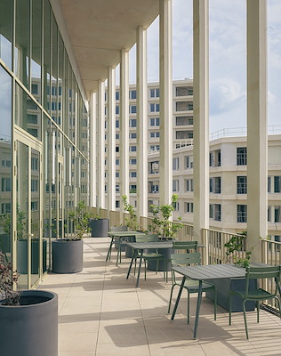 Een verticale tuin ontspringt uit het park, met groene buitenruimtes die met elkaar verbonden zijn door open trappen. Deze wand loopt over de hele breedte van het gebouw en zorgt voor goede koeling in het klimaat van Bordeaux en voor aangename ruimtes voor interactie en ontspanning. De verticale tuin komt uit op een collectieve bovenverdieping met groene buitenruimtes en rondom een panoramisch uitzicht over Bordeaux.