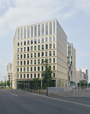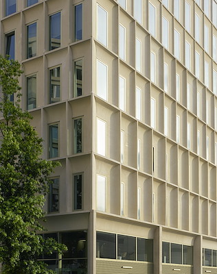 De gevels zijn ontworpen met een gridstructuur die voor visuele samenhang zorgt. De ramen worden geleidelijk groter naarmate ze hoger geplaatst zijn, en creëren bovenin weidse uitzichten. De gevels zijn gemaakt met zandkleurig gepigmenteerd beton, dat de geest van de historische stenen architectuur van Bordeaux weerspiegelt.