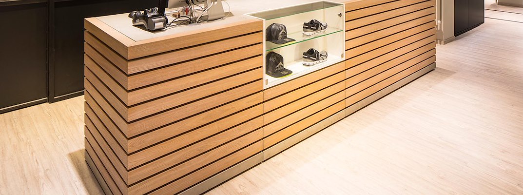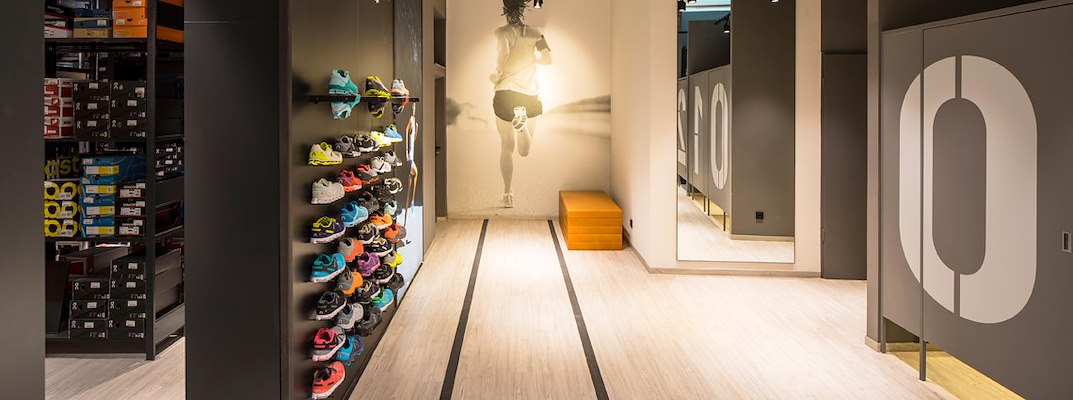 Het ontwerpconcept komt vooral tot uiting in de materiaalkeuze: in het vloerontwerp staat hout voor "handwerk", terwijl het idee van urban running kan worden ervaren door beton. De combinatie van verschillende decors kenmerkt ook de verschillende zones van de winkel.