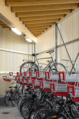 Aan de hofzijde hebben we een kleinschalig houten paviljoen toegevoegd, waarin de fietsenstalling en waterretentie zijn ondergebracht. Het regenwater dat hier wordt opgevangen, wordt hergebruikt door de bewoners. In de warme uitstraling van het hout hebben we het contrast gevonden met het massieve staal van C14, en binnenkort met de andere gebouwen die in Tolhuiskade zullen verschijnen. ’s Avonds licht het paviljoen met zijn lamellengevel op als een lantaarn en wordt het een vriendelijk herkenningspunt in de nieuwe buurt.