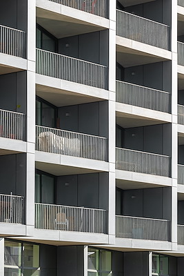 Vanuit dit idee konden we alle buitenruimtes in C14 op het zuiden en aan het water positioneren. Grote glazen puien verbinden deze balkons naadloos met de appartementen, waardoor het daglicht en uitzicht de woningen volledig binnentreden.