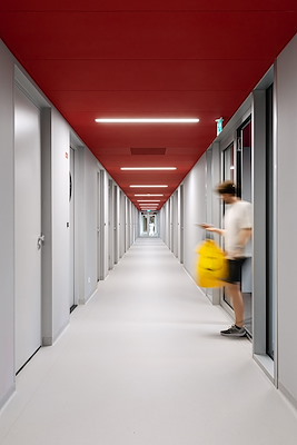 We hebben het Hart ontworpen als een plek die zowel flexibel als uitnodigend is: geschikt voor alles van studeren in de buitenlucht tot gezamenlijke evenementen. De aftrappende platforms dienen als zitplekken, terrassen of informele podia, die spontaan gebruik stimuleren. Direct aan het Hart zijn de collectieve functies binnen ingericht om het sociale leven van het gebouw te versterken: een gemeenschappelijke woonkamer met keuken en lange eettafel, intieme studiehoeken, een tv-lounge en wasfaciliteiten. Een verdiepinghoge glazen wand verbindt de woonkamer met de universiteitscampus.
