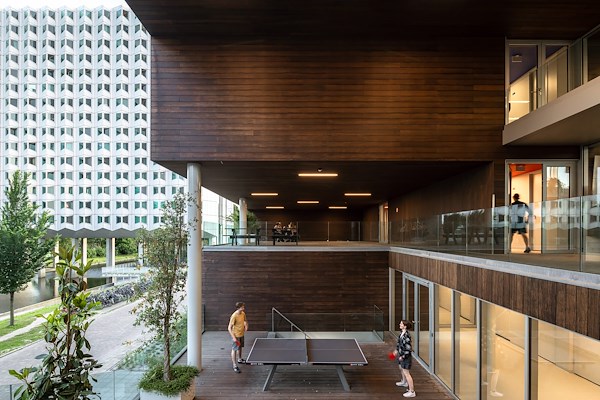Suite 9 brengt nieuw leven op de TU Delft Campus met 137 zelfstandige studentenwoningen. Midden in het gebouw ligt het ‘Hart’: een enorme semi-buitenruimte die het opvallende profiel van Suite 9 vormt en de plek is waar het studentenleven spontaan kan ontstaan.
