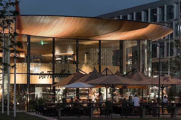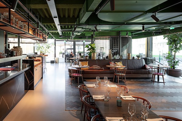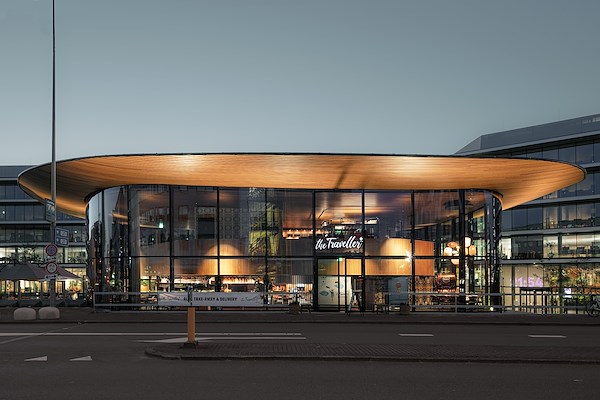 Strikingly transparent and with a welcoming organic form, The Traveler fits in beautifully with the green landscaped grounds (to be completed in early 2020) and surrounding buildings, especially the new ING offices designed by Benthem Crouwel Architects. It houses a restaurant concept from the team behind successful Amsterdam eateries Visaandeschelde and The Roast Room. The restaurant is open all day, offering light refreshments and a full menu of international dishes reflecting the neighborhood's multicultural identity. There are versatile spaces for meetings and events upstairs.