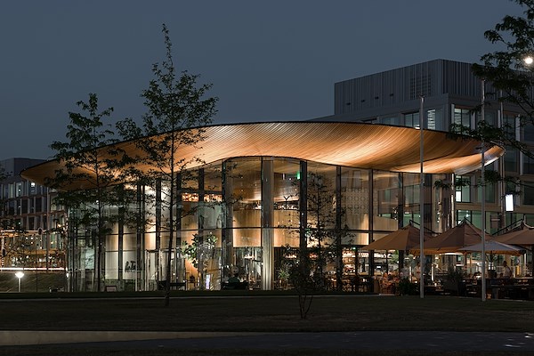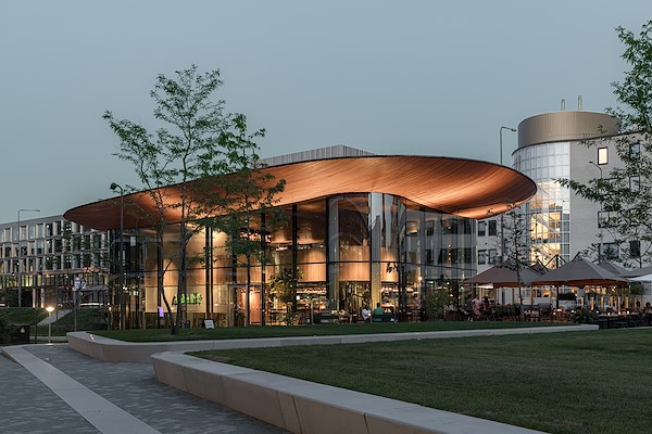 The pavilion owes its eye-catching appearance to a minimalist glass facade combined with a sculptural, freestanding wooden core. The separation of wooden core and glass facade – at no point do they touch each other – creates an airy and flowing interior space. The wooden ceiling and abundant greenery bring nature inside.