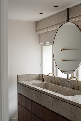 Bij het ontwerp, de materiaalkeuze en de inrichting van de villa is bijzondere aandacht besteed aan kwaliteit en beleving. Luxe materialen zoals travertin, brons en eikenhout, in combinatie met natuurlijke behangsoorten en textiel, voegen een extra tactiele dimensie toe die essentieel is voor een hoogwaardig ontwerp. Alle vier de verdiepingen worden verbonden door een coherente materiaaltoepassing en een zorgvuldig uitgebalanceerd kleurenpalet. Monumentale elementen zijn op doordachte wijze geïntegreerd met moderne en duurzame ingrepen, waardoor een unieke dialoog is ontstaan tussen historie en eigentijdse architectuur.