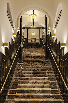Toen Dalata Hotel Group D/DOCK vroeg om de lobby nieuw leven in te blazen en de identiteit van Clayton te versterken, zag de in Amsterdam gevestigde studio meteen het potentieel van een ruimte die voornamelijk als foyer werd gebruikt. Archiefonderzoek bracht een foto uit de jaren 30 aan het licht waarop de lobby was opgedeeld in verschillende zones, een levendige indeling die als inspiratiebron voor het ontwerp diende. Door deze indeling opnieuw te introduceren, bracht D/DOCK ritme en functionaliteit terug naar de begane grond, voortbouwend op een eerdere renovatie waarbij belangrijke historische elementen al waren hersteld.De nieuwe receptie straalt verfijnde elegantie uit, terwijl de MICE-faciliteiten (meetings, incentives, conferences and exhibitions) zijn omgevormd tot multifunctionele ruimtes die geschikt zijn voor zowel zakelijke als recreatieve gasten. De ontbijtzaal is zorgvuldig gerestaureerd om weer aan te sluiten bij het historische Café Americain, een van de beroemdste cafés van Amsterdam en een ontmoetingsplaats voor schrijvers, kunstenaars en intellectuelen, vaak ook wel de ‘huiskamer van Amsterdam’ genoemd. Originele details zijn behouden en gecombineerd met een nieuwe, prachtig vormgegeven buffetruimte om een warme, intieme ruimte te creëren waar zowel ontbijt als privédiners of kleine bijeenkomsten kunnen worden gehouden.Het hotel, gebouwd in het begin van de 20e eeuw, heeft een art nouveau-karakter met invloeden van de Amsterdamse School en is een van de best bewaarde voorbeelden in zijn soort in Nederland. De gevel, een combinatie van diverse stijlen en elementen die de verscheidenheid aan functies binnen het gebouw weerspiegelen, is voorzien van prachtig glas-in-lood, terwijl het interieur is voorzien van sierlijk houtwerk en decoratieve details, ontworpen door de Nederlandse architecten Willem Kromhout en Herman Gerard Jansen.Het hotel combineert nu zijn erfgoed met hedendaagse charme, een verbetering die de aantrekkingskracht vergroot en tegelijkertijd de authentieke ziel behoudt.