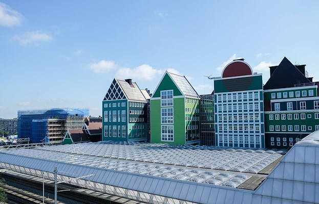 Het contrast tussen de moderne overkapping en de traditionele Zaanse huisjes maakt het project extra bijzonder. De strategische toepassing van lichtkoepels en windschermen versterkt deze interactie: een spel van licht en schaduw dat het station een speelse, uitnodigende uitstraling geeft.