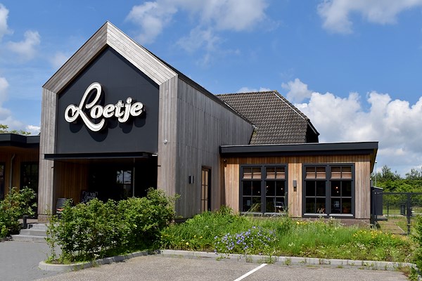 Loetje heeft een nieuwe locatie geopend in het midden van de natuurlijke omgeving van de Loonse en Drunense Duinen. De nieuwe vestiging is prachtig vormgegeven met een houten gevel van Fraké Noir®. Deze keuze is perfect afgestemd op de omringende groene omgeving en straalt een luxe uit die naadloos past bij het karakter van het restaurant. Op de foto’s is duidelijk te zien hoe Fraké Noir onbehandeld natuurlijk vergrijst: de delen die minder blootstaan aan UV-licht vertonen minder vergrijzing dan de delen die volop zonlicht vangen.