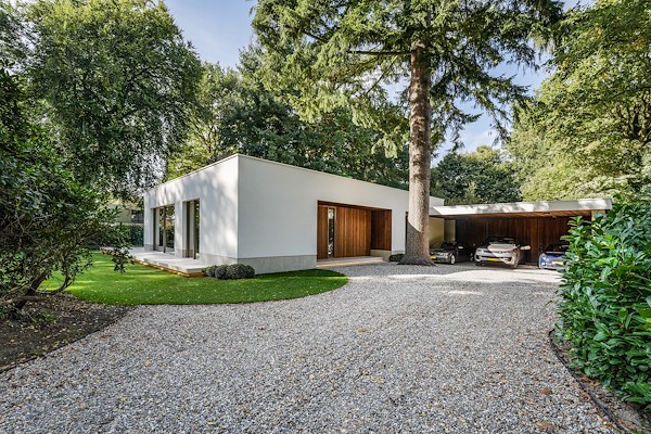 De ernorme boom op de kavel is bewust gehandhaafd en ingepast in het ontwerp, waarbij de funderingen speciaal zijn aangepast aan de wortels. Buitengevels zijn wit gestukadoord gecombineerd met duurzame houten gevelbekleding en natuursteenelementen. De grote veranda met zwevend terras en de grote glazen puien verbinden binnen en buiten op unieke manier. Prachtig wonen in de natuur.