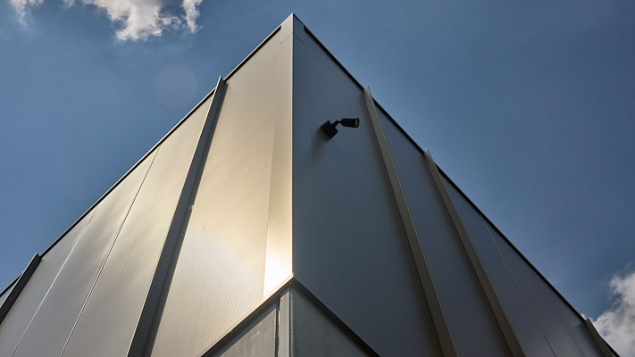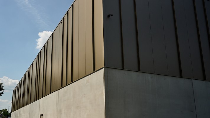 De gekozen beige stone kleur van de sandwich gevelpanelen contrasteert subtiel met de bosrijke, groene omgeving. Door de goudachtige gloed van de coating ontstaat, zeker bij zonlicht, een warme uitstraling die het gebouw een verfijnde, levendige uitstraling geeft.