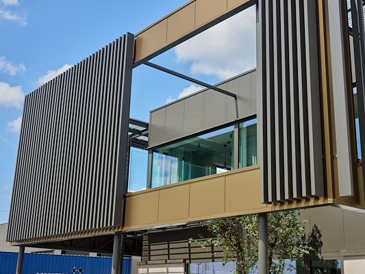 Centraal in het ontwerp staat de keuze voor het QuadCore AWP gevelpaneel met een bronzige, warmbruine Euromax-coating. Deze afwerking zorgt voor een luxe en opvallende uitstraling, die in het oog springt zonder schreeuwerig te zijn. De kleur vormt een krachtig contrast met de omgeving en onderstreept het professionele karakter van Jacobs Transport.