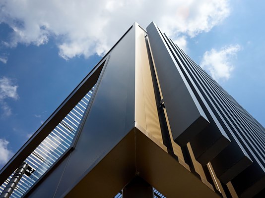 De QuadCore AWP Mini-Micro gevelpanelen zijn voorzien van een Euromax coating in een bronze, bruinige kleur: Middle Bronze C33/A055. Het gebouw is ontworpen voor BURO B en gerealiseerd door Derdeale+.