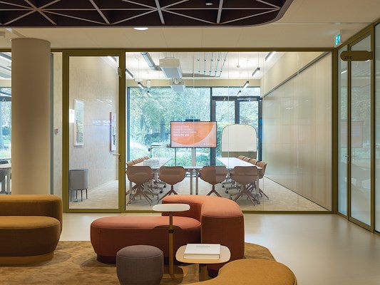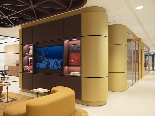 Door de hele etage loopt uniek maatwerkinterieur dat de ruimtes functioneel én speels houdt. De ronde receptiebalie vormt het warme middelpunt, met een bijpassende luifel die bezoekers welkom heet. Elders in de ruimte creëren lichte, afgeronde kasten rust, terwijl in diverse werkplekken AECTUAL Gradiënt-panelen en Arte behang een verfijnde afwerking toevoegen. De akoestiek is versterkt met Piet Ceiling Panels en Archisonic Terra Cotton.
