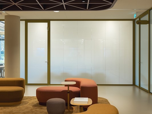 Bijzondere materialen vroegen om precisie in elk detail. Door keuzes vroeg in het proces vast te leggen, konden techniek en ontwerp naadloos samenkomen. Een semi-automatische paneelwand biedt flexibiliteit tussen vergaderruimten en een weggewerkte elektrische schuifdeur verbergt de personeelskeuken in het centrale blok. Zelfs de techniek achter Switchfoil International is zorgvuldig meegenomen in het ontwerp, waardoor het eindresultaat niet alleen mooi maar ook doordacht is.