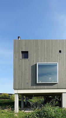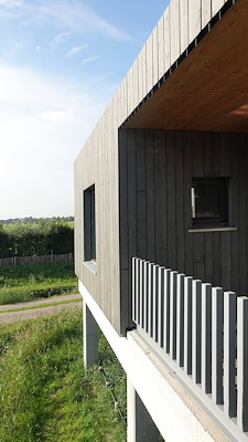 Het landschapsontwerp breidt het architectonische concept verder uit dan het gebouw zelf. Een netwerk van sloten rondom het huis herinnert aan historische grachten, maar functioneert ecologisch als waterretentie, habitatcreatie en microklimaatregulatie. Onder de verhoogde constructie ontstaat een beschaduwde ecologische niche, die bijdraagt aan biodiversiteit en het gebouw subtiel maar betekenisvol integreert in zijn omgeving.