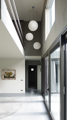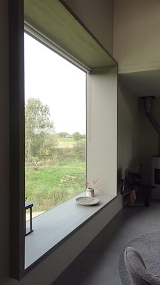 De ramen volgen een strikte vierkante geometrie. Hun diepte, verhouding en positie creëren een catalogus van ruimtelijke ervaringen: diepe neggen om te zitten, hoge openingen gericht op de lucht, smalle sleuven die doen denken aan schietgaten, en grote kozijnen die panoramisch uitzicht bieden op de rivier en het omliggende landschap. Deze openingen articuleren de gevel en choreograferen tegelijkertijd de relatie tussen binnen en buiten.
