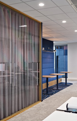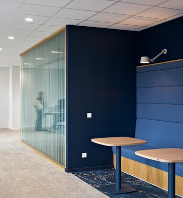 In een moderne kantooromgeving zoals de Office is akoestiek essentieel om productiviteit en werkcomfort te waarborgen. De systeemwanden zijn daarom voorzien van hoogwaardig akoestisch gelaagd glas. Vergaderruimtes blijven zo volledig afgesloten van het geluid op de werkvloer, terwijl belhokjes specifiek zijn ontworpen voor privacy tijdens gesprekken.