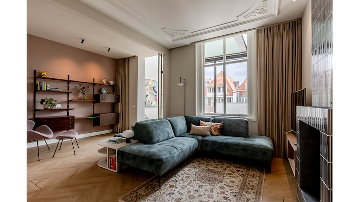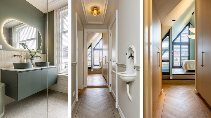 Op de eerste verdieping is de woonverdieping gerealiseerd. Binnen de aanwezige ornamentenplafonds ontwierpen we een moderne ensuite-kast die de verschillende ruimtes definieert én verbindt. Het dakterras op het platte dak aan de voorzijde, evenals de toegang daartoe, is verbeterd.
