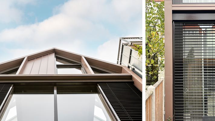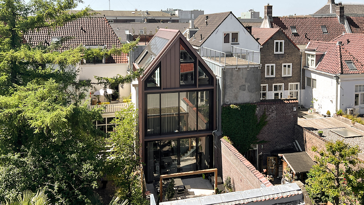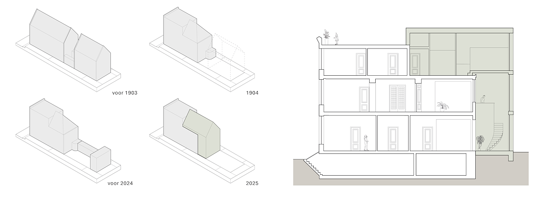 De drie verdiepingen hoge aanbouw vormt een ruimtelijk en verbindend element aan de achterzijde, precies op de plek van de voormalige patio. De hoogte versterkt de aanwezigheid van de historische achtergevel. Door hier bewust een eigentijdse toevoeging te maken, in zowel materiaal als vorm, blijven de historische structuur en de verschillende bouwfases helder afleesbaar.