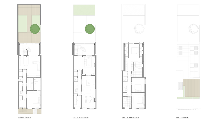 Het huidige pand bestaat uit twee voordeuren, een woning op de begane grond met tuin en een bovenwoning op de eerste en tweede verdieping. De opdrachtgever wenste het pand terug te brengen naar één woning, zoals vóór 1903 het geval was. Daarnaast kozen we ervoor de toevoegingen uit de jaren tachtig, zowel de aanbouwen als de kapverdieping, te verwijderen om de achterzijde meer lucht en ruimtelijkheid te geven.