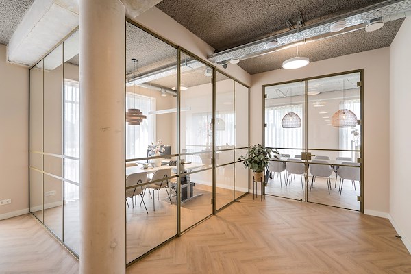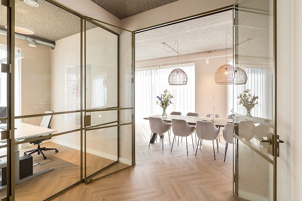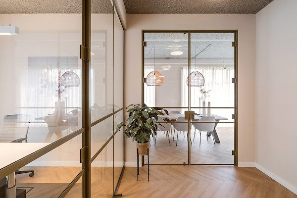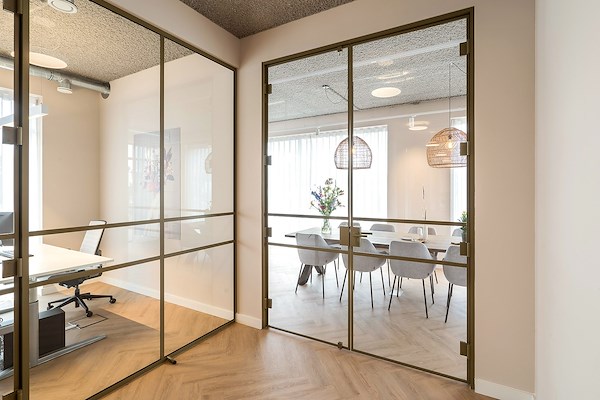 De ClassicFrame systeemwand heeft van zichzelf een industriële uitstraling. Met de nu gebruikte kleurstelling past de wand perfect in de toon van het kantoor. De dubbele glazen deuren geven toegang tot de vergaderruimte met een maatwerk mediameubel. Deze is, net als de pantry, zo gebouwd dat deze aan beide zijden een functie heeft.