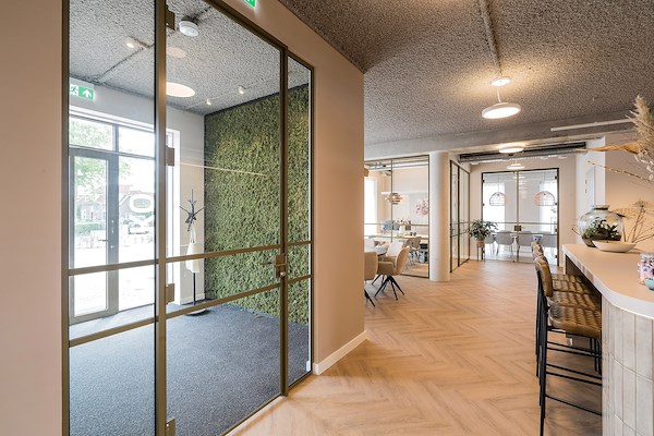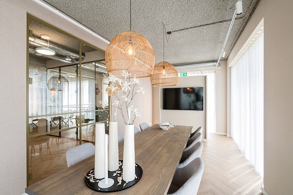Bij binnenkomst loop je tegen het hart van het kantoor aan. De ontmoetingsplek in de vorm van een maatwerk dubbele pantry met bijbehorende zitgelegenheid. Een echte eyecatcher met een luxe en warm design. Zo wordt de toon gezet voor de rest van de kantooromgeving.