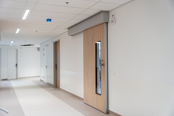 aangebracht. Voor de wanden bij de ruimte waar het röntgenapparaat staat, heeft Knauf geadviseerd om gipsplaten met lood (loodgipsplaten) toe te passen ten behoeve van adequate stralingsafscherming. Het resultaat is een robuust en stil binnenwandsysteem dat merkbaar bijdraagt aan rust en privacy – essentieel in een zorgomgeving.