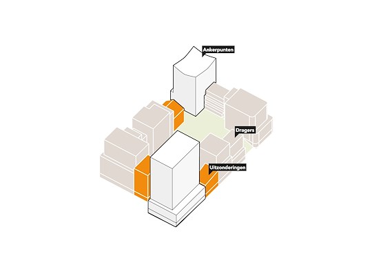 Het ontwerp is opgebouwd uit 13 verschillende panden die de schaal van de blokken opbreken. Door hiërarchie aan te brengen tussen de panden en de hoger gelegen gevels terug te laten springen ontstaat een karakteristiek stadsbeeld dat nauw aansluit op de omgeving. Relatief eenvoudige gebouwen vormen de basis en worden aangevuld door stevige panden met een sterke identiteit én bijzondere panden die kleiner en uitbundiger zijn. Materiaal-, kleurgebruik en gevelcompositie geven de panden een eigen identiteit terwijl een doorlopend stedelijk weefsel behouden blijft. Het rijke palet aan gevelmaterialen bestaat uit baksteen, natuursteen, aluminium, keramiek, hout, plaatmateriaal en geprofileerde staalplaat. Om de diversiteit tussen de panden te versterken heeft GROUP A als coördinerend architect voor een aantal panden samengewerkt met BETA en ZOETMULDER