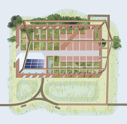 Om de Liesbosch ruïne heen wordt de sfeer gecreëerd van het moeraslandschap zoals het was voor menselijke interventie. Dit staat in contrast met cultuurlijke moestuinen binnen de ruïne die verwijzen naar de periode van landbouw. De contouren van de verhoogde plantvakken volgen de vorm van de oorspronkelijke droogkamers, waarvan de funderingen nog zichtbaar zijn in de verharding. Het contrast wordt versterkt door een tussenlaag van de overblijfselen van de industriële periode, de Liesbosch-ruïne. Deze tijdslaag wordt aangezet door de toevoeging van een eenvoudige houten constructie die een idee geeft van het volume van de oorspronkelijke steenfabriek. Het ontwerp vraagt om een flexibel en multifunctioneel programma, omdat de activiteiten in de tuin sterk seizoensgebonden zijn. Er is gekozen voor een grote open ruimte in het midden, waar bijvoorbeeld een markt gehouden kan worden maar waar ook ruimte is voor voorstellingen en andere activiteiten. De kas kan ’s winters bijvoorbeeld dienstdoen als ontmoetings- of werkplek. Om de tuin grotendeels zelfvoorzienend te laten functioneren, is in het moerassige exterieur een helofytenfilter aangelegd. Hierin wordt regenwater verzameld, gefilterd en opgeslagen voor bijvoorbeeld irrigatie van de moestuin. Met behulp van zonnepanelen wordt energie opgewekt om dit systeem en andere functies van stroom te voorzien.