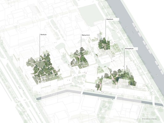 De grootste tuin, de Klimaattuin (blok 7), richt zich volledig op verkoeling, waterberging en royale vergroening. Wandelroutes doorkruisen het gebied en bieden bewoners en bezoekers een groene, verkoelende verblijfservaring.