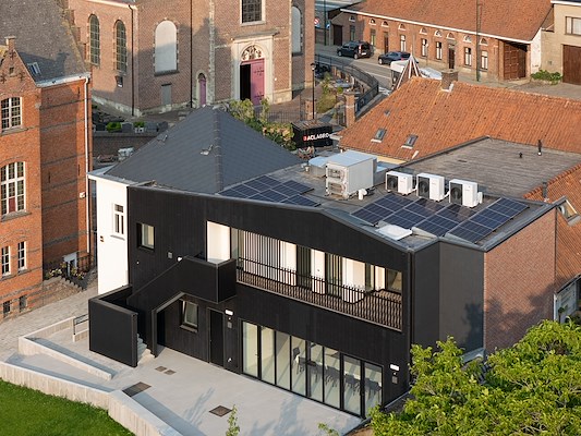 ), anderzijds een moderne achterliggende bijbouw. Deze laatste is integraal bekleed met zwarte