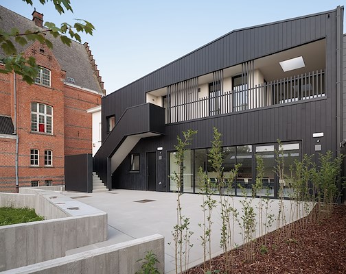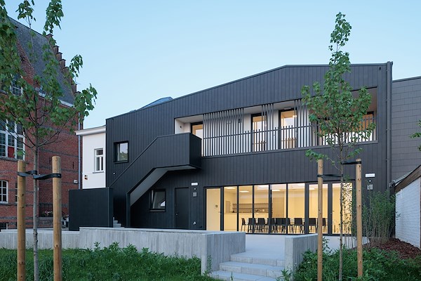 In de charmante dorpskern van Horebeke, in het hart van de Vlaamse Ardennen (België), verrees een nieuwbouw met drie uiteenlopende functies: een politiepost, een polyvalente zaal en een noodwoning. Het gebouw kreeg een tweeledige vormgeving: enerzijds een rustieke witte voorgevel, die gereconstrueerd is naar origineel model (inclusief dakbedekking met