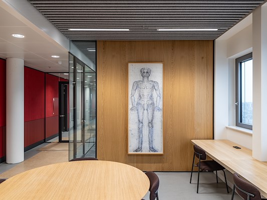 In de kantoortoren leverden we een combinatie van enkelglas en dubbelglas wandsystemen, aangevuld met gesloten wandpanelen met afwerkingen in staal, fineer en vilt. De wanden zijn volledig losmaakbaar en flexibel, wat perfect aansluit bij de activiteitgerichte werkomgeving die DNB voor ogen had. Als een afdeling groeit, krimpt of van functie verandert, kan de indeling eenvoudig worden aangepast – zonder ingrijpende verbouwingen.