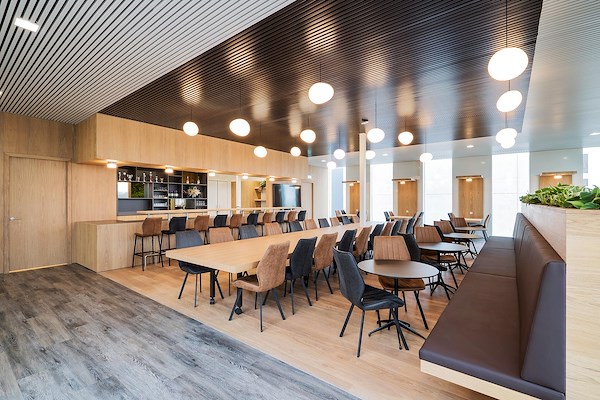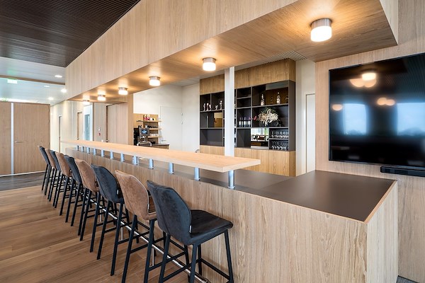 Het maatwerk interieur sluit perfect uit bij de uitstraling van het kantoorgedeelte. Naast de ontvangstbalie is op de eerste verdieping een ontmoetingsruimte ingericht waar medewerkers en gasten in een warme, huiselijke sfeer kunnen vertoeven.