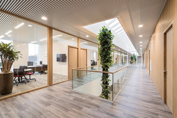 en de centrale lichtstraat dragen hieraan bij. Overdadig daglicht in combinatie met de white-wash WoodFrame gangwanden en deuren, zorgen voor de juiste mix tussen een zakelijke en huiselijke werkomgeving.