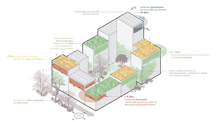 Voor de wijk introduceerden we het concept van de “Merwede Biotoop”, een zorgvuldig ontworpen ecosysteem dat is afgestemd op de verschillende zones in het gebied en waarin flora en fauna op natuurlijke wijze kunnen gedijen. Onze aanpak van het vormgeven van de openbare ruimte houdt rekening met zowel de ruimtelijke behoeften van de nieuwe bewoners als de vereisten van de lokale fauna, waarbij altijd wordt gezorgd voor veilige doorgangen en schuilmogelijkheden voor de dieren in het gebied. Onze visie is dat mensen, dieren en planten in Merwede harmonieus naast elkaar kunnen leven op basis van een relatie die ontstaat vanuit wederzijds respect.