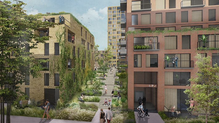 Het ontwerpproces is diepgeworteld in de principes van de “healthy city”, waarbij een actieve levensstijl en inclusiviteit worden gestimuleerd. Tegelijkertijd wordt er aandacht besteed aan klimaatadaptatie en duurzame doelen. Het opvallende besluit om een volledig autovrije wijk vorm te geven maakt het mogelijk om extra ruimte toe te wijzen aan groen en langzame mobiliteit, waardoor Merwede een uitzonderlijk groene en natuurinclusieve wijk zal worden. Het robuuste groen-blauwe raamwerk dat we voor de wijk hebben gedefinieerd vormt de basis voor een effectieve klimaatstrategie om het hitte-eilandeffect te reduceren en stormwater te beheren.