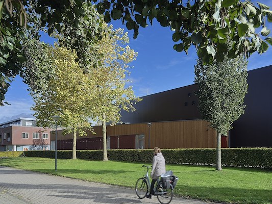 Ook het materiaalgebruik is afgestemd op de circulaire ontwerpprincipes. Er is gekozen voor duurzame, onderhoudsarme materialen met de mogelijkheid tot toekomstig hergebruik. Er is gekozen voor kleuren passend in de directe bebouwde omgeving. De sporthal is onopvallend in kleurtoon en aansluitend op de naastgelegen gebouwen. De gevel van de laagbouw is voorzien van een warme kleur baksteen en houten gevelbekleding.