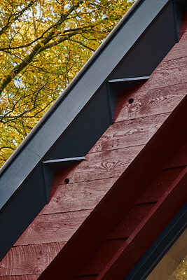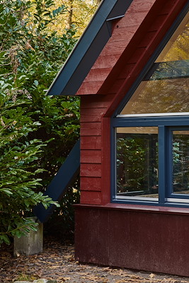 De uitbreiding volgt de logica van het oorspronkelijke A-frame en verlengde het ritme van de woning over twee bouwlagen. Alleen bij het terras breekt een nieuw element bewust met de bestaande vorm. Het dak is daar schuin afgesneden, zodat het zonlicht diep het vakantiehuis invalt, terwijl het grote overstek beschutting biedt tegen regen en zomerse hitte. De uitsnede van het buitenterras is bewust afwijkend gematerialiseerd, als een markering van het moment waarop de woning zich opent naar het bos.
