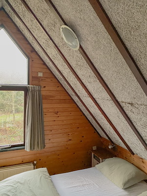 In het interieur zorgt het schuine plafond en het hoge zuidkozijn voor een lichte en ruimtelijke sfeer. Natuurlijke, robuuste materialen dragen bij aan een ontspannen leefritme. Terracotta vloertegels lopen door tot op het terras, waardoor binnen en buiten naadloos in elkaar overgaan. Boven is een knusse bedstee voor volwassenen gecreëerd en een kinderslaapkamer met een dubbel stapelbed, gedragen door boomtakken die verwijzing naar het bos buiten.