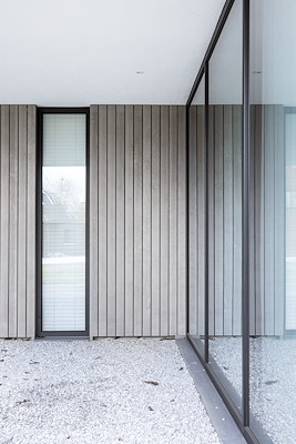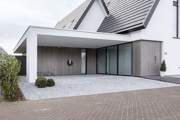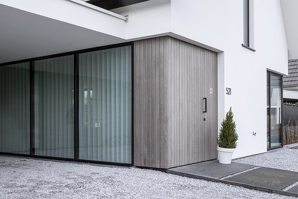 Bij het ontwerp van deze luxe villa is gekozen om gebruik te maken van hout als decoratie aan de gevel. Bij deze woning is gebruik gemaakt van Fraké Noir® behandeld met een voorvergrijzer van Rubio Monocoat. Het hout is op deze manier een sieraad aan de gevel en geeft een luxe uitstraling.