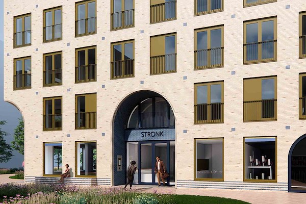 De Stronk is een hoogte accent binnen het bouwblok en reageert op zichtlijnen langs de fietsstraat, het cultuurplein en de binnentuin. De lichtgele baksteen gevel met een regelmatig grid van ramen met Franse balkons maken het gebouw tot een eenheid. Dit ritme wordt versterkt door een regelmatig gestempeld grid van blauw geglazuurde baksteen accenten. Dit regelmatige ritme is vervolgens op specifieke plekken verfijnd om het gebouw een speels en vriendelijk karakter te geven met menselijke maat.